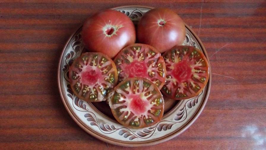 Растение можно выращивать в открытом грунте или в теплице. Спелые плоды имеют темно-бордовый оттенок. Томаты отличаются округлой формой и слегка приплюснуты. По периметру есть небольшие складки. В помидорах содержится много сахара, потому они отличаются сладким вкусом.