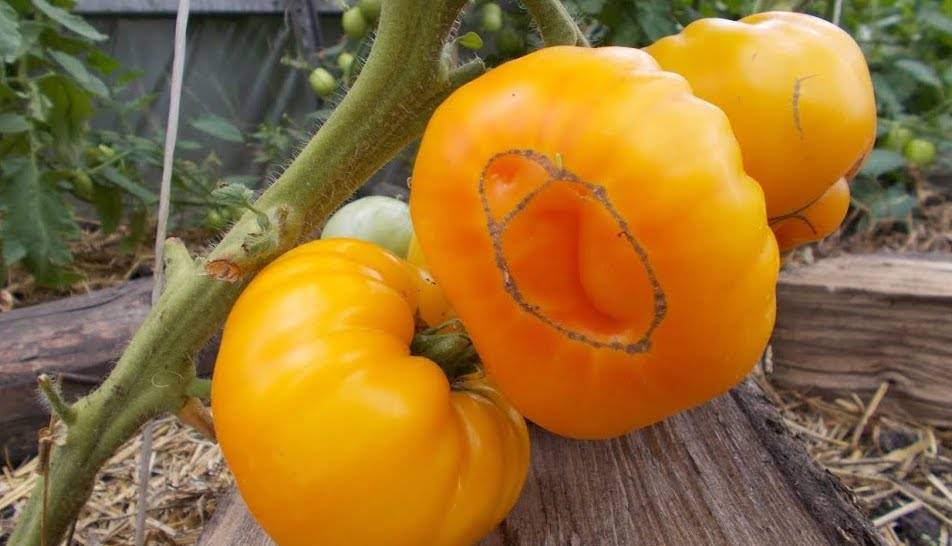 Внешний вид интересен не только размерами. Окраска плодов любого оттенка отличается тем, что у плодоножки долго сохраняются зеленоватые пятна. Даже у вызревших помидоров цвет не всегда равномерен.
