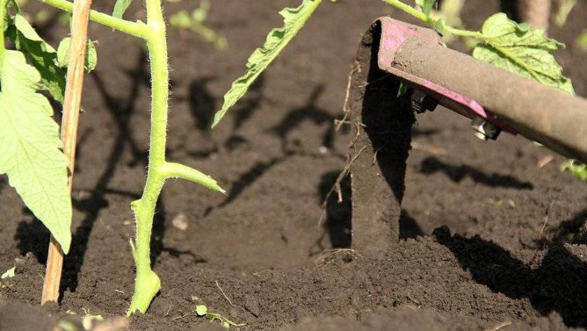 Рыхление почвы и одновременное удаление из неё сорных растений точно не помешает при выращивании томатов описанного сорта, особенно если речь идёт о молодых растениях, которые ещё не окрепли и не адаптировались в открытой почве. Обе процедуры желательно выполнять после очередного увлажнения субстрата, но не углубляя инструмент больше чем на 10–15 см в толщу грунта.