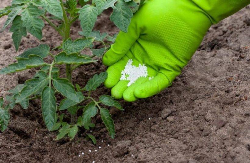 Первая подкормка азотными удобрениями проводится в момент активного роста стеблей и листьев, сразу как высаженные кусты укоренятся. Второе внесение удобрений приходится на момент цветения. Тогда у томата повышается потребность в калии. Для ее удовлетворения в почву вносят сернокислый калий. Третья подкормка проводится через 20 дней после первой и для нее используют настой золы. Когда начинается период плодоношения, необходим суперфосфат. Его заделывают в почву под кустами и после поливают ее. Гранулы растворяются медленно, поэтому длительное время питают растения. Нормы внесения удобрений указываются на их упаковке.