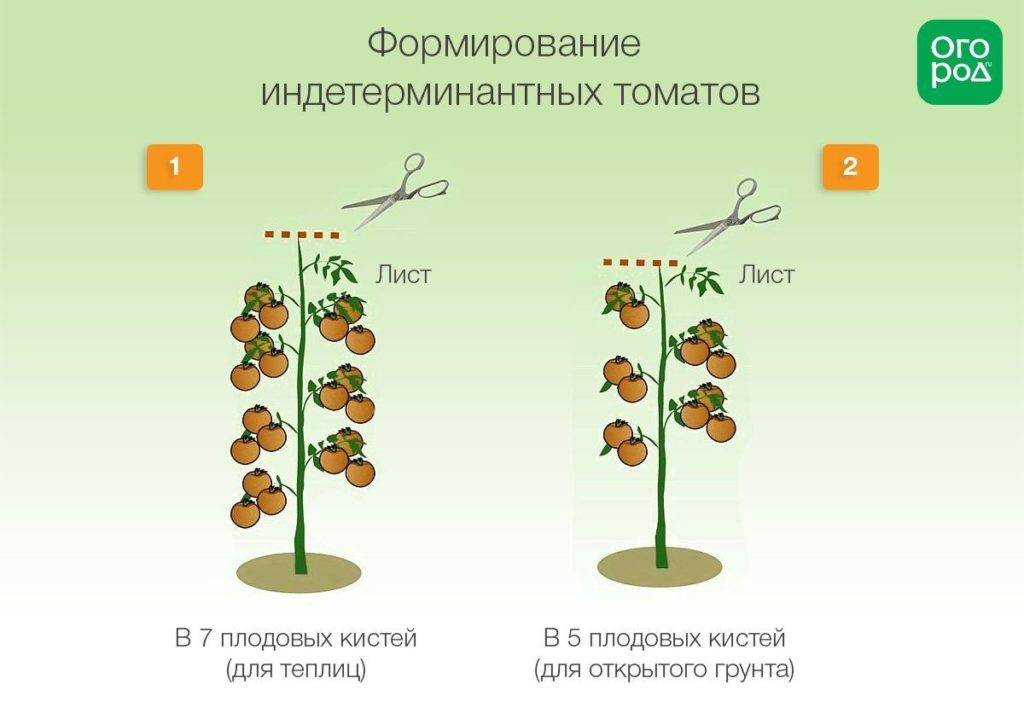 В начале августа проводят прощипывание всех кустов, удаляя им макушку, и тем самым останавливают их рост. В середине августа обрывают все цветы. В первых числах сентября всю завязь, размер которой менее 2 см, обрывают, чтобы оставшиеся томаты успели до холодов набрать достаточный вес.