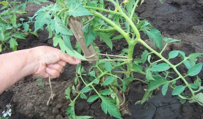 Подвязывать нужно, начиная с того времени, как куст укоренился в постоянном месте. Также для подвязывания между рядами можно натянуть проволоку и привязывать растения к ней поочерёдно. Овощеводы утверждают, что подвязка снижает нагрузку на стебель, плоды более открыты солнечным лучам, они не будут находиться на земле и вырастут крупнее.