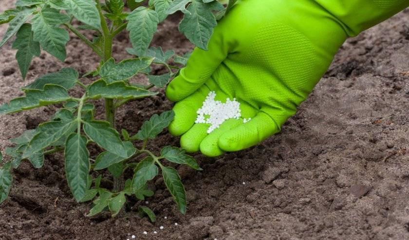 - Внесение удобрений. В почву до высадки томатов вносят перегной, после чего грунт перекапывают. В весенний период территорию удобряют аммиачной селитрой.