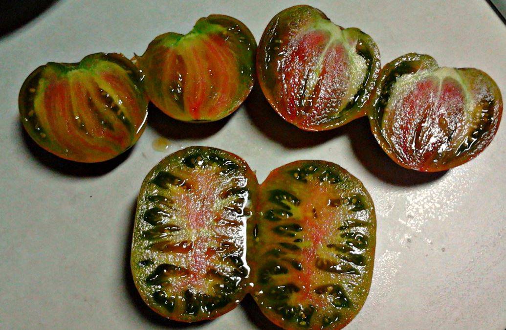 - Если говорить о плодах, то они очень необычные. Прежде всего, в своем окрасе. Они зеленые, с бордово-коричневым цветом, и бронзовым оттенком. Разрез у них — зеленый с розовой сердцевиной. Об их форме можно сказать следующее: сердцевидные, с тупым концом. Или более округлые.