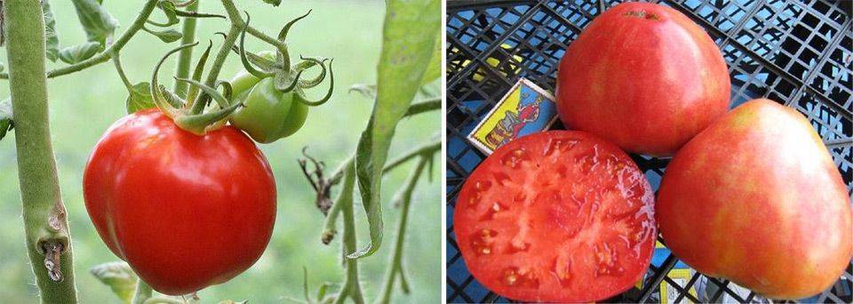 Высота растения на грядах – до 70-80 см, сам куст с тонким стеблем и поникающими листьями. Обязательно требуется опора и подвязка. Плоды крупные, около 400 граммов, красного цвета с мясистой сахарной мякотью и сладкие. Использование – соки, салаты, соусы.