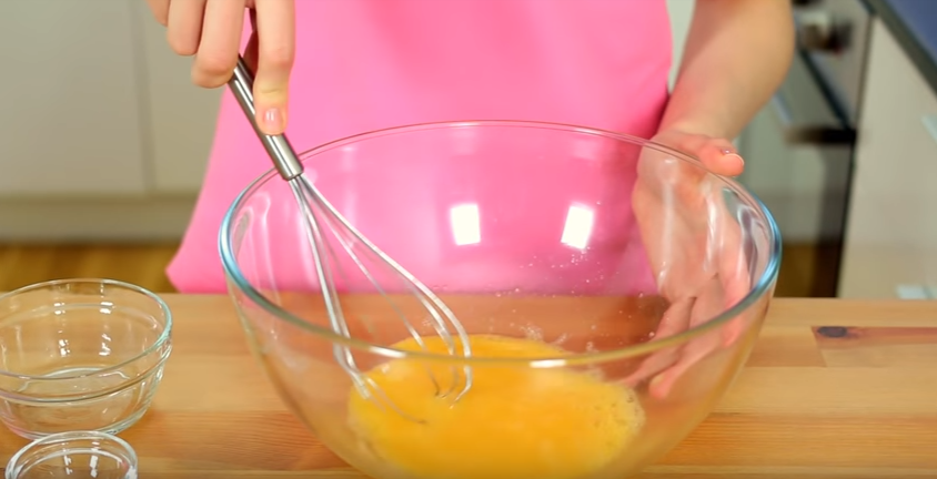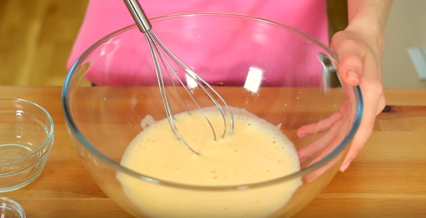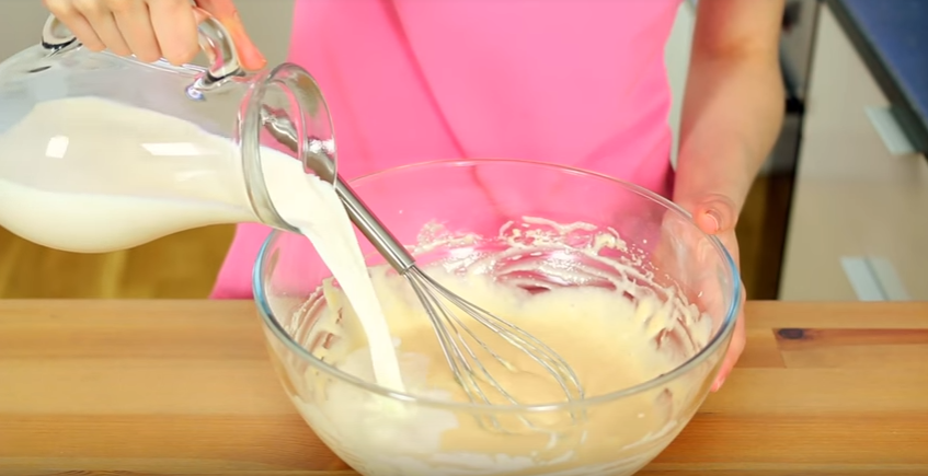- Когда яйца как следует, взобьются, влейте в них половину молока. Снова тщательно перемешайте.