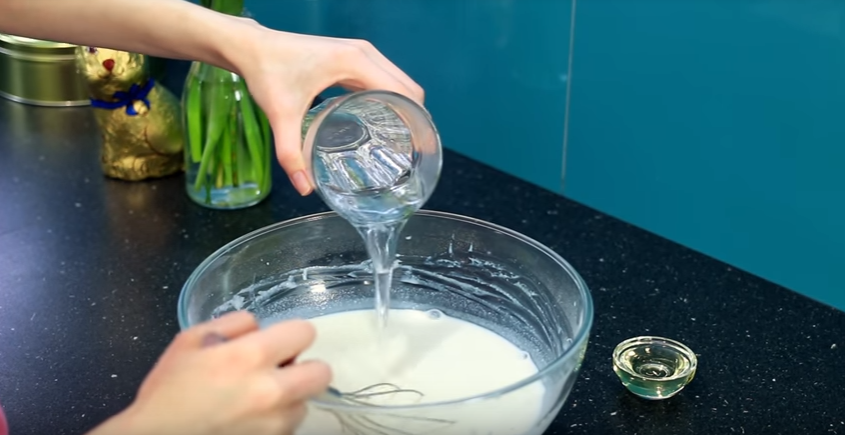 4.Let’s add half a bottle of milk into the bowl and flour and mix it. Then let’s add the other half the bottle of milk and more flour and mix it again. – Добавим половину бутылки молока в миску и муку и взобьем их. Затем добавим вторую половину бутылки молока и муку и взобьем все снова.