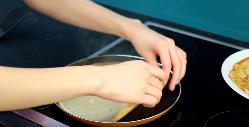 - Аккуратно, чтобы не порвать, перевернуть блинчик, обжарить с другой стороны буквально пару секунд.