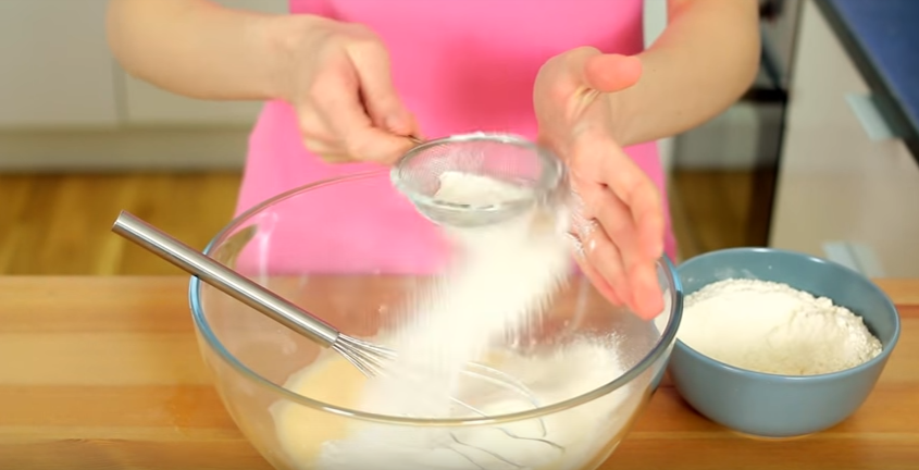 - Отдельно просеять муку. Подсыпать муку к тесту небольшими порциями и взбивать до однородности, убирая комочки.