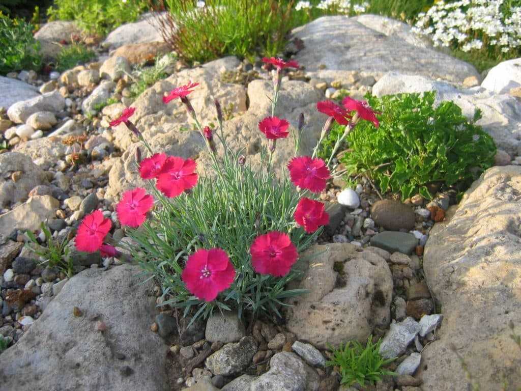 - Гвоздика (Dianthus) – выращивать необходимо на хорошо освещенным участке, осуществляя минимальный полив, цветы появляются летом и имеют белый, красный и розовый оттенок.