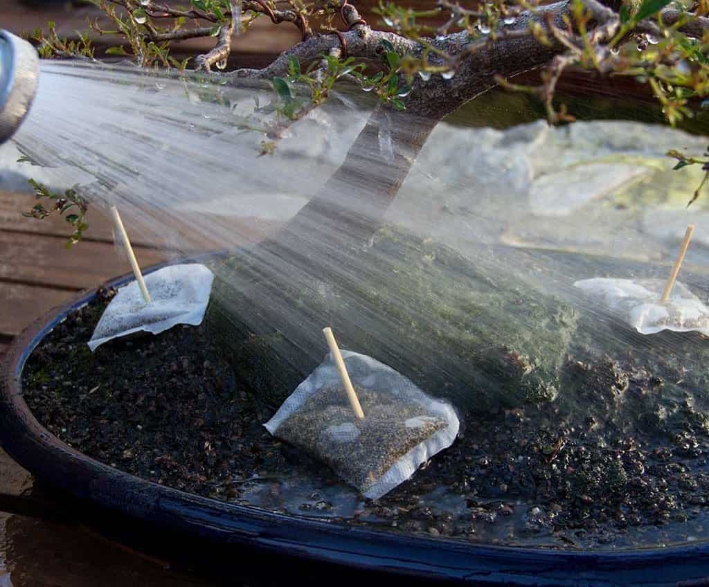 Ошпаривание кипятком или горячий раствор марганцовки очень хорошо подойдут для обработки горшка. Так вы защитите японский бонсай от грибка корневой системы.