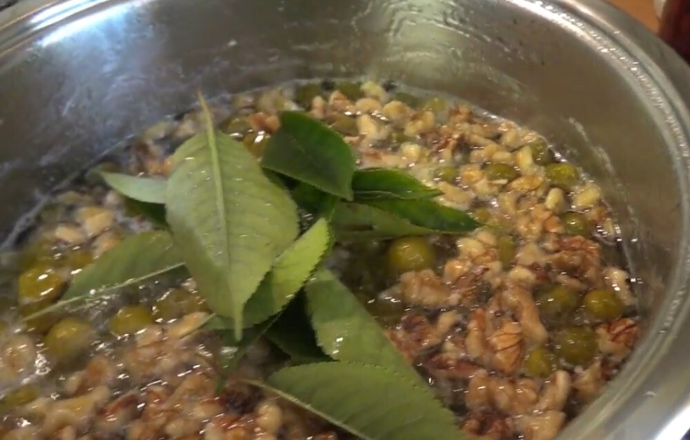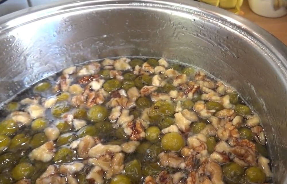 Царское варенье из крыжовника с вишневыми листьями и грецкими орехами