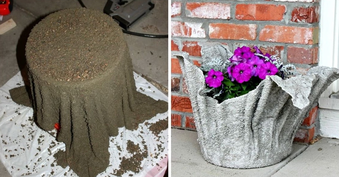Очень красиво смотрятся вазоны, которые изготавливаются из бетона и ткани. Получается настоящее произведение искусства.