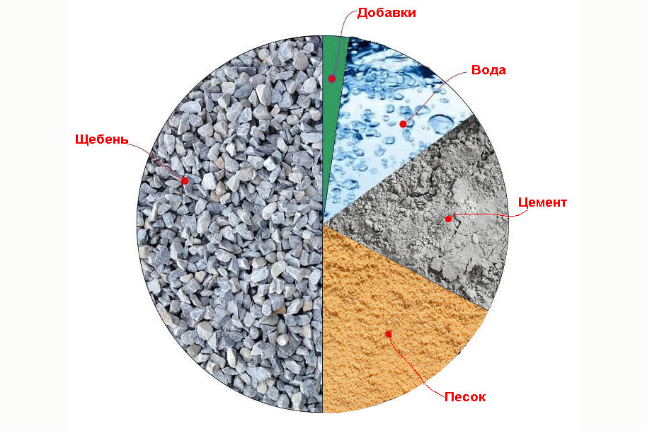 Сначала замешивается бетон. Он состоит из нескольких компонентов — их название и примерное соотношение вы можете видеть на представленной картинке ниже: