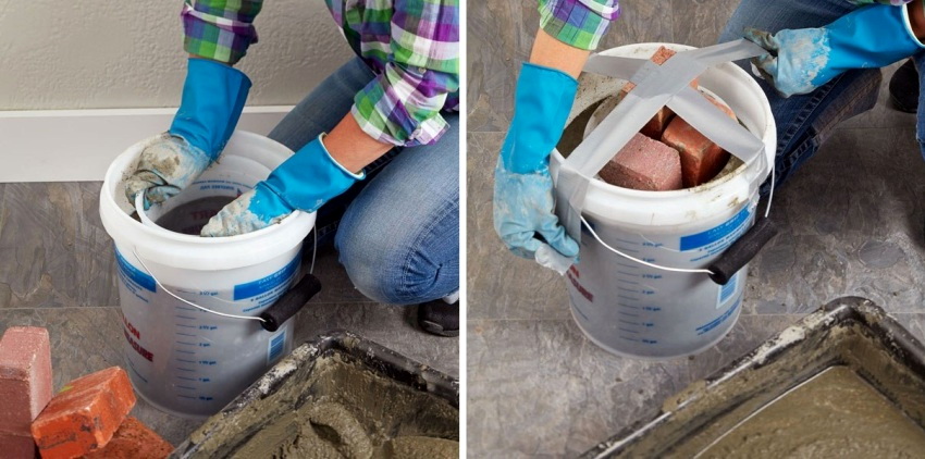 - Готовят раствор, наполнитель создают из мелких фракций. Выдерживают соотношение частей цемента и песка 2 к 3. Можно сразу добавить пигмент для оттенка смеси. Раствор должен быть средним по густоте.