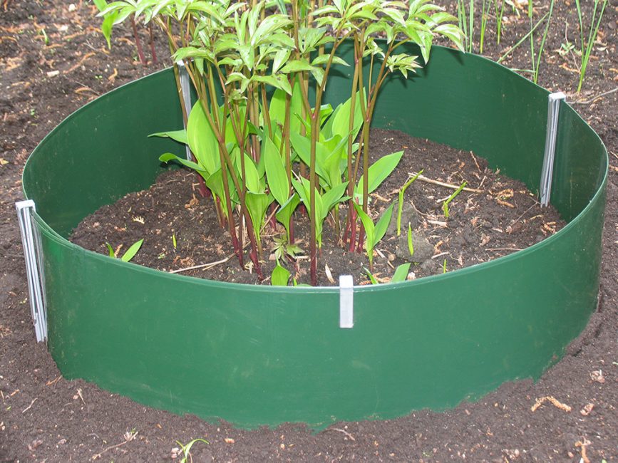 - Пластиковые бутылки. Наполненные песком или иным материалом бутылки вкапывают горлышком вниз в почву. По периметру стягивают проволокой.
