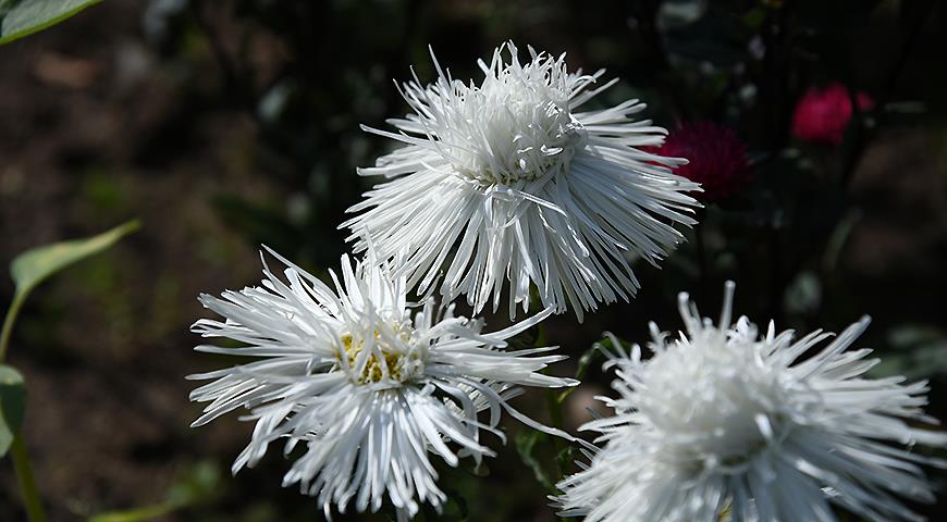 Оригинальным эффектным внешним видом обладают представители игольчатой группы астр. Такое название она получила за счет того, что язычковые лепестки крупного соцветия сворачиваются в трубки, очень похожие на иглы. Чаще всего язычки срастаются по краям. Соцветие в диаметре до 6-8 см, раскрывается в конце июля. Плотный кустик полностью отцветает к началу осени. Наиболее популярный сорт игольчатой китайской астры — дракон неоново-пурпурной, рубиновой расцветки или цвета слоновой кости. Крайние лепестки, сворачиваются в трубочки, которые сгибаются к центру соцветия, напоминая коготки. Рост кустика китайской астры «Дракон» — 60-70 см, часто выращивается на срез.