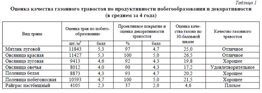 Теперь попробуем определить, какая трава лучше для газона. Ученые провели исследования и оценили пригодность использования различных семян для газона, в баллах.