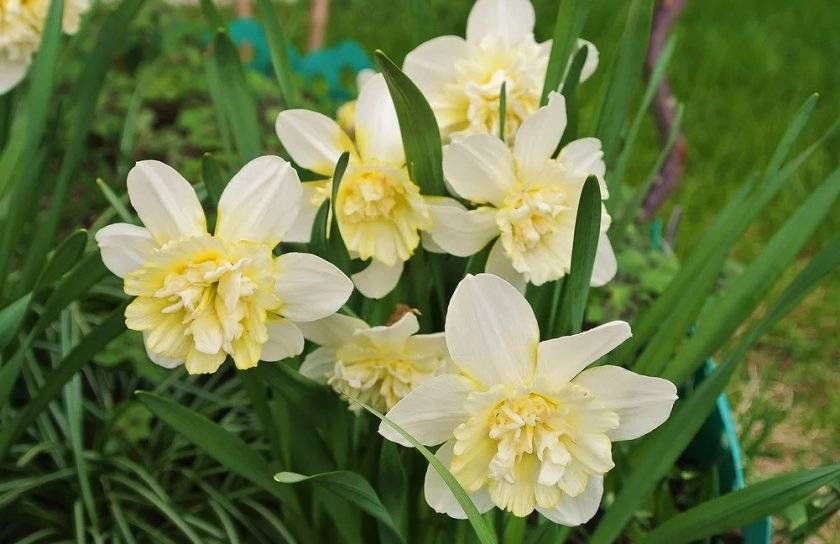 Так как листья нарциссов долго не увядают, то рядом с ними можно посадить растения с густой листвой, например, герань или хосту. Тогда участок будет смотреться аккуратно.