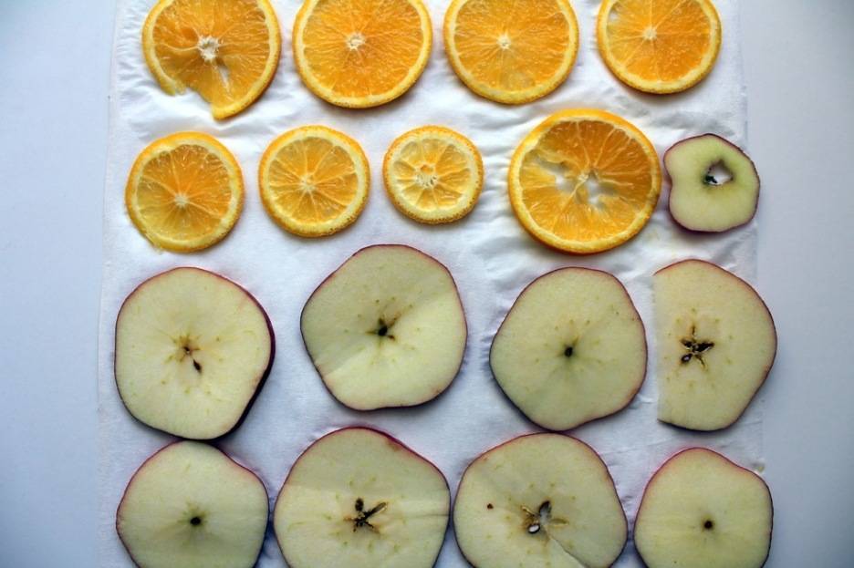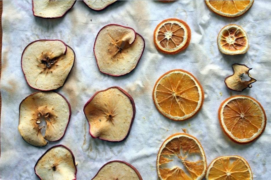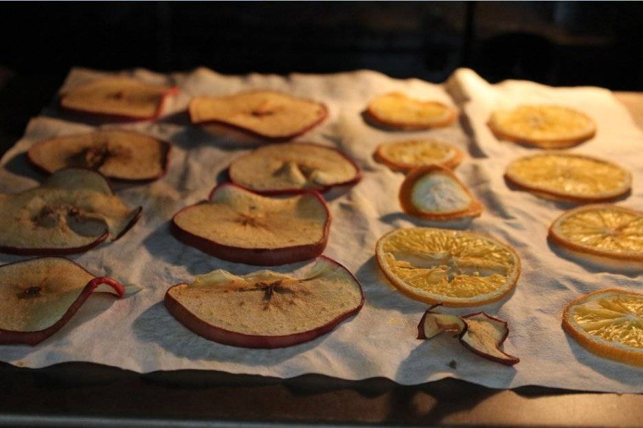Нарезаем апельсин и яблоко на круглые дольки. Выкладываем их на лист пергамента и оставляем на один день, чтобы они немного подсохли.