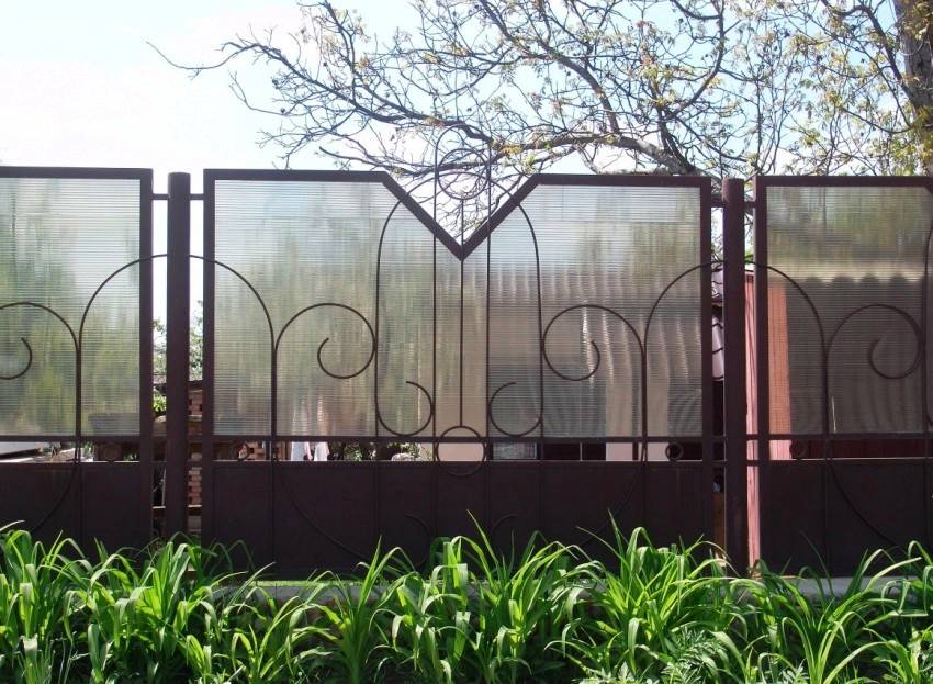 Наиболее интересный способ использования карбоната – монтаж подобного забора с ковкой. В зависимости от индивидуальных условий можно подобрать прозрачные или полупрозрачные листы поликарбоната. Специалисты советуют использовать второй вариант в сочетании с металлическими коваными прутьями. Существует возможность монтажа ПКБ позади секций (с внутренней стороны).