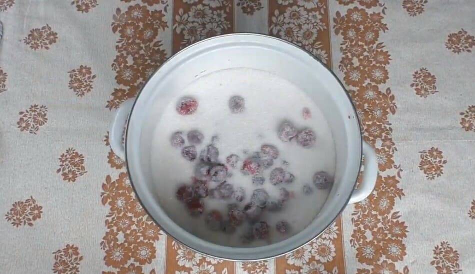 - Ягоды высыпать в кастрюлю, засыпать 3 стаканами сахара. Оставить смесь на 6 часов.