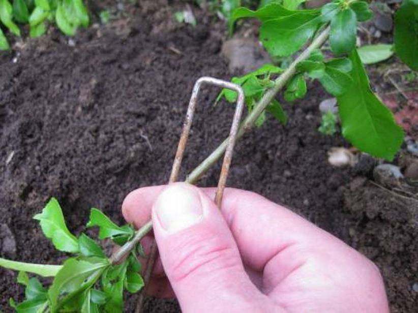 Считается самым простым методом. В начале лета грунт вокруг кустов хорошо разрыхляется и в нём проделываются борозды глубиной 10 см. Далее выбираются из нижней части растения несколько однолетних побегов, которые укладываются в борозды и закрепляются там при помощи скоб. После чего борозды засыпаются грунтом. Побег при этом прикапывается целиком, необходимости в том, чтобы его верхушка оставалась на поверхности (как, например, у смородины) нет.